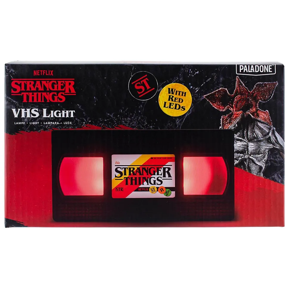 - Ce Stranger Things VHS Logo Light vous transportera dans les années 80 avec son boîtier de cassette. Allumez la lumière et les bobines LED projetteront une étrange lueur rouge à travers la pièce.