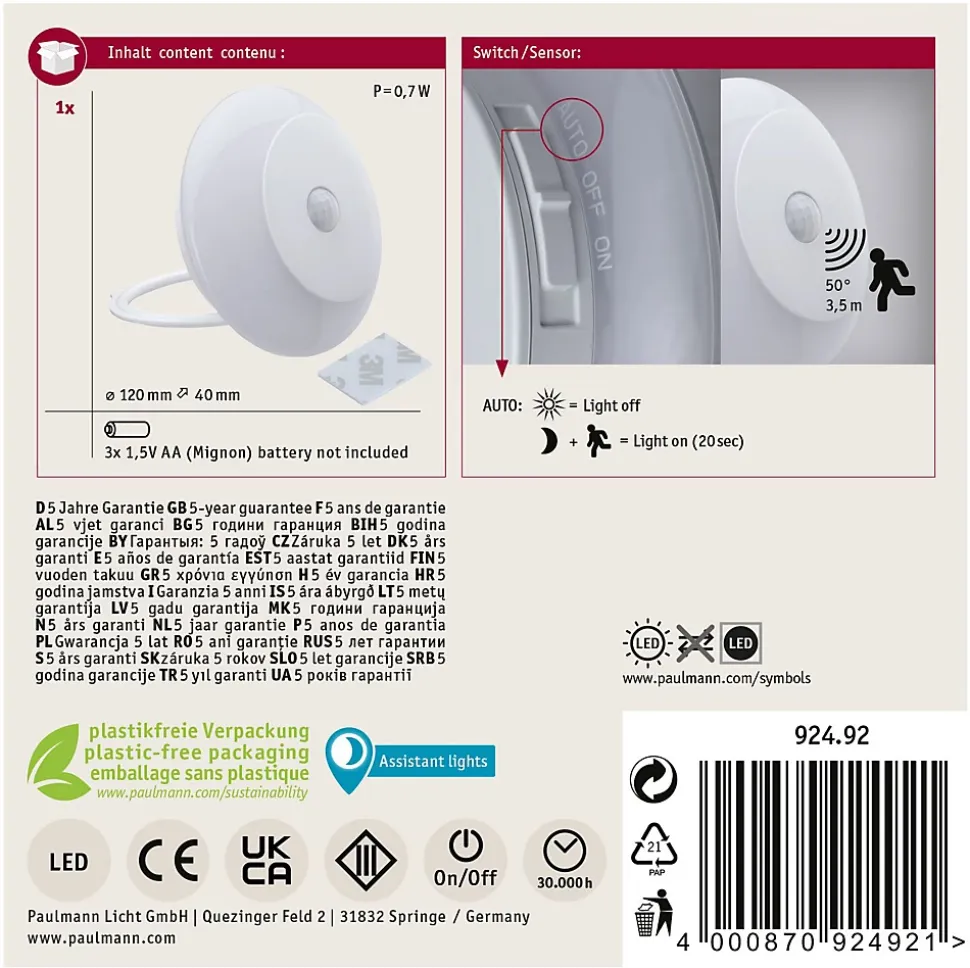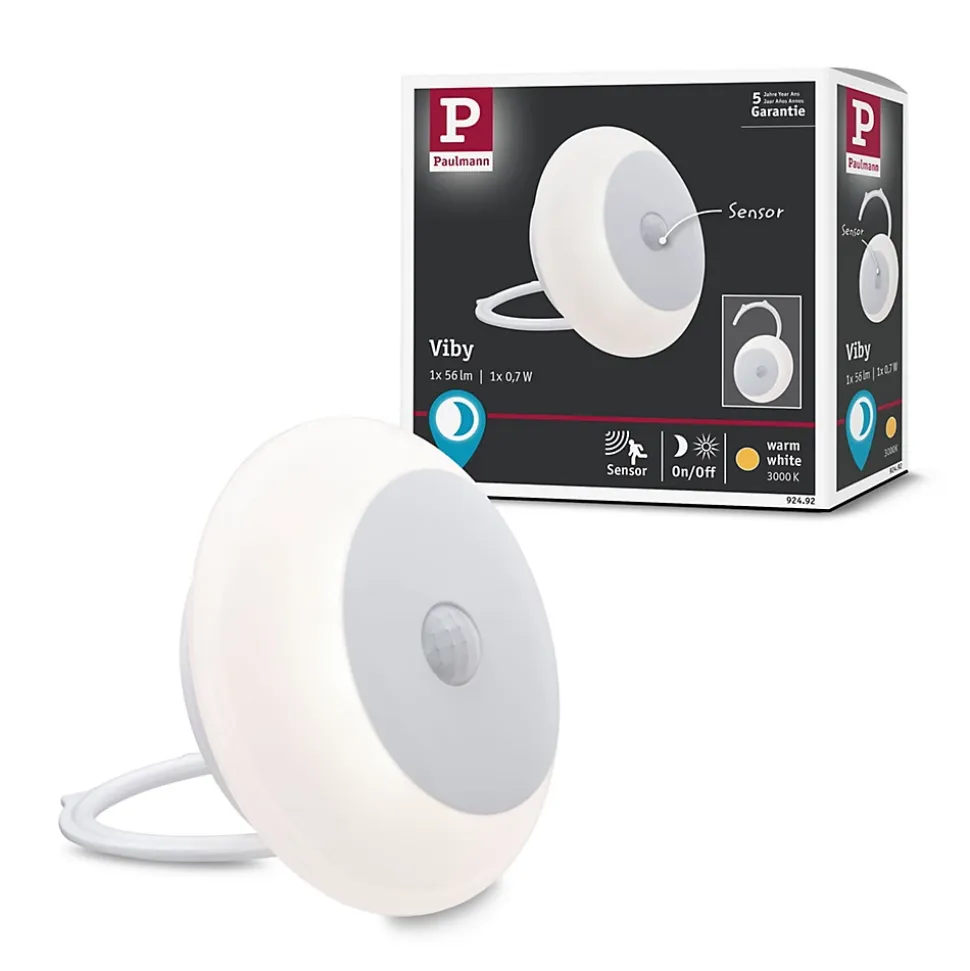 La veilleuse ronde Viby est votre compagnon idéal dans les pièces sombres et offre une sécurité de nuit. Son fonctionnement sur piles permet de la transporter et de la poser, l’accrocher ou la coller là où vous le souhaitez. La lumière s’allume par détecteur de mouvement. Selon le réglage, la veilleuse peut être activée en permanence ou mise en marche par un détecteur crépusculaire.