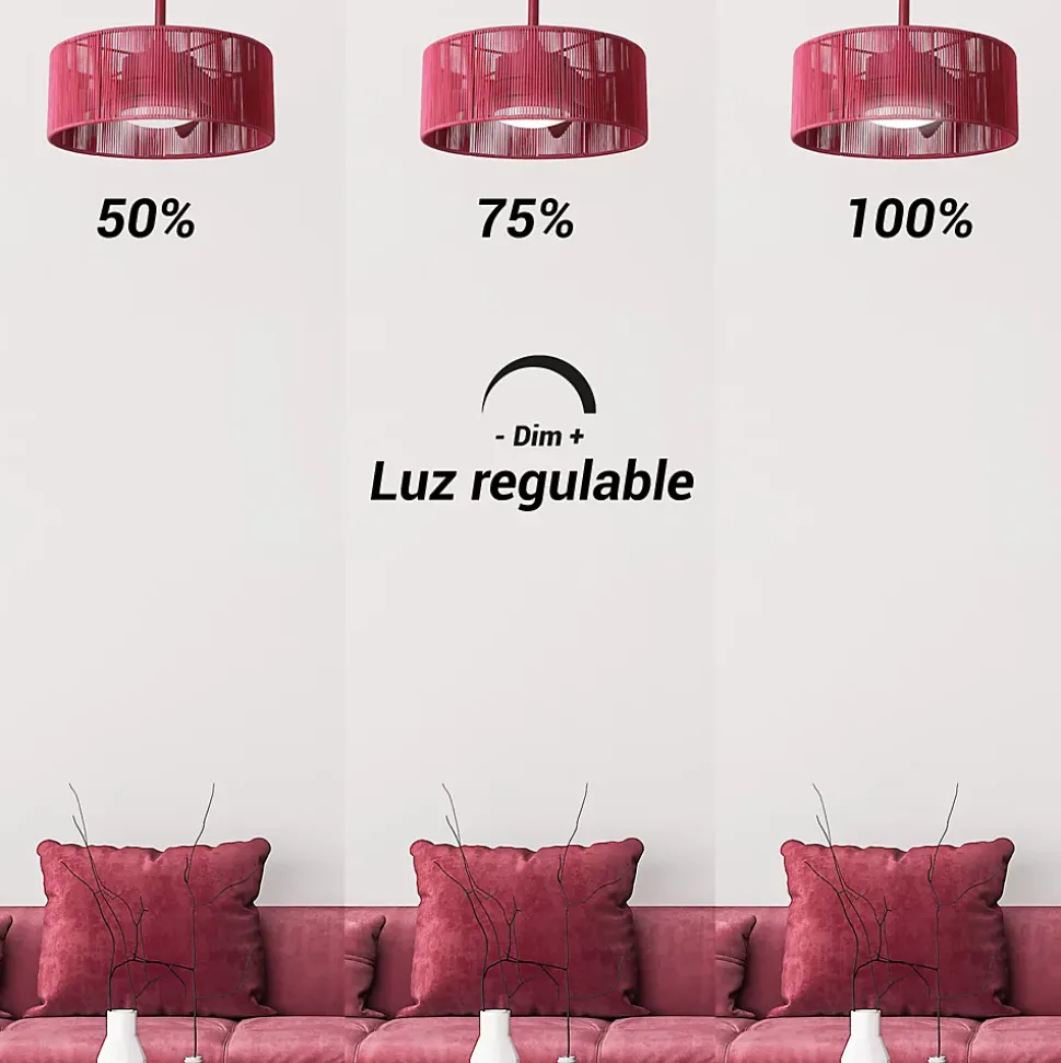 Ventilateur de plafond Sulion Lur avec lumière. Appartenant à la série Style, ce sont des éventails qui recherchent l’excellence dans leurs formes, sans négliger leurs fonctions uniques. Avec un diamètre de 52cm et un large airflow, il est parfait pour les petites pièces jusqu’à 13m2, ainsi que pour une utilisation en extérieur grâce à son IP44. Il dispose d’un abat-jour décoratif bordeaux, simulant un luminaire, dans la lignée du mobilier d’extérieur tendance. Il a la fonction Je sens, la fonction brise et la minuterie. L’intensité et la température de la lumière LED intégrée sont réglables. Les nouveaux ventilateurs Sulion sont équipés d’un moteur DC 2.0, ce qui réduit le bruit, améliore leur démarrage et leur durabilité, tout en réduisant la consommation d’énergie, grâce à leurs meilleures performances mécaniques et électriques.
