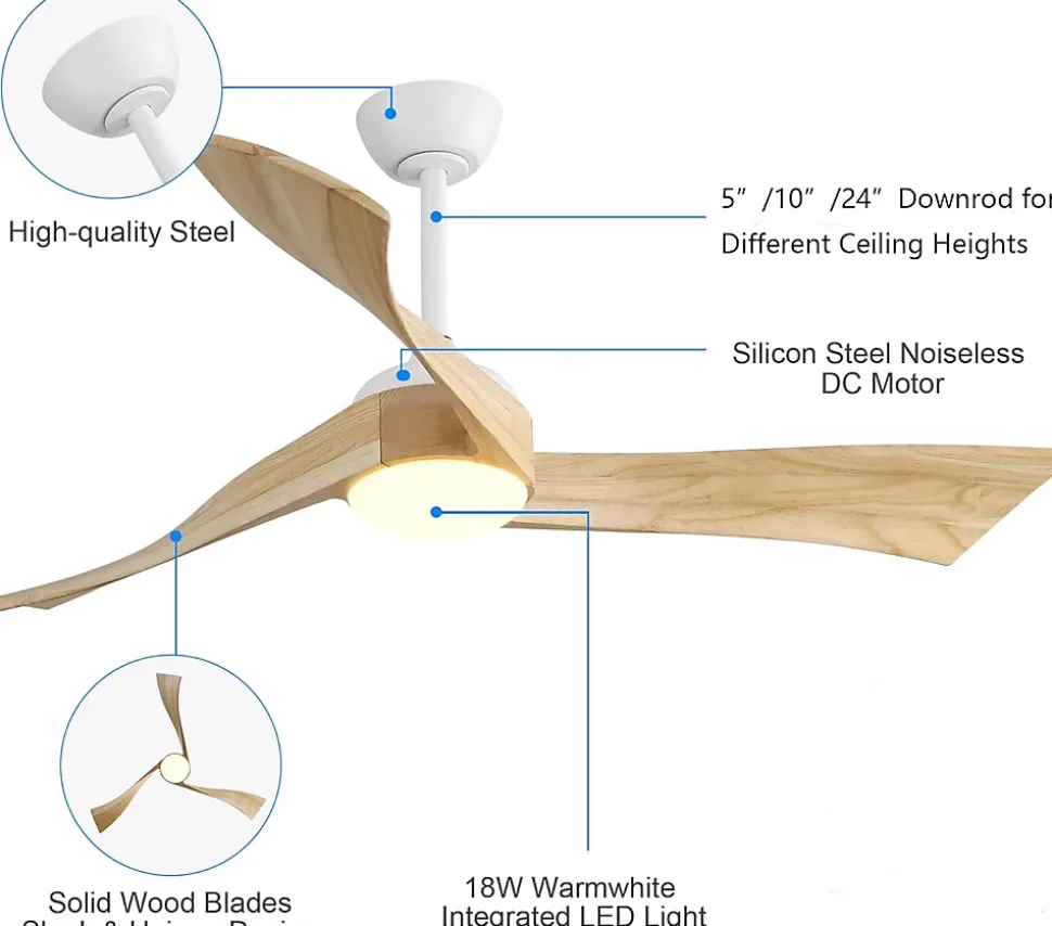 【Moteur à économie d’énergie】Le moteur à courant continu permet d’économiser jusqu’à 65 % d’énergie par rapport aux moteurs à courant alternatif conventionnels – fonctionnement fluide et durable【Fonctionnement été et hiver】Avec sens de rotation réversible – pour une circulation d’air frais en été et une répartition uniforme de la chaleur en hiver【Télécommande incluse】6 niveaux de vitesse, minuterie (1/4/8h) et changement de direction peuvent être facilement contrôlés – idéal pour le confort quotidien【Ailes en bois de haute qualité】3 ailes en bois massif aspect bois naturel – durables, stables et adaptées aux intérieurs modernes, scandinaves ou minimalistes【Utilisation polyvalente】Pour les espaces intérieurs de 15 à 33㎡ – chambre, salon, salle à manger, bureau ou balcons couvertsCaractéristiques du produit :Diamètre : 132 cm (52 pouces)Couleur : Boîtier blanc avec pales couleur bois naturelMatériau : Métal et bois massifMoteur : Moteur à courant continu réversible – silencieux, économe en énergie et durableNiveau sonore : <35 dB – idéal pour les chambres et les espaces de travailVitesse : 6 vitesses de ventilation sélectionnablesFonctions : Marche arrière pour l’hiver, marche avant pour l’été, fonction minuterie (1/4/8 h)Tension : 85–265 V, 50–60 HzTaille de pièce recommandée : 15–33 m² – idéal pour les chambres, les salons, les salles à manger, les bureaux ou les espaces extérieurs couverts