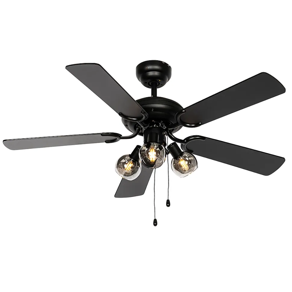 Le Mistral est un ventilateur de plafond vraiment cool ! Il s’intègre parfaitement dans un intérieur industriel. La lampe est en acier et de couleur noire. Grâce à ses 3 points lumineux, le Mistral attire immédiatement le regard ! Son diamètre est de 107,5 cm et sa hauteur de 43,8 cm. N’oubliez pas de commander des ampoules à culot E14 pour compléter la lampe. Le Mistral est compatible avec un variateur externe, ce qui vous permet de régler facilement l’ambiance. Les pales sont réversibles, vous pouvez donc choisir entre une finition noire ou bois. Ce ventilateur de plafond dispose à la fois d’un réglage été et d’un réglage hiver. En mode été, le ventilateur tourne dans le sens inverse des aiguilles d’une montre pour fournir un rafraîchissement. En mode hiver, il tourne dans le sens des aiguilles d’une montre pour faire descendre l’air chaud et rendre le chauffage plus efficace. L’interrupteur à tirette vous permet de régler la vitesse et d’allumer et d’éteindre la lampe.