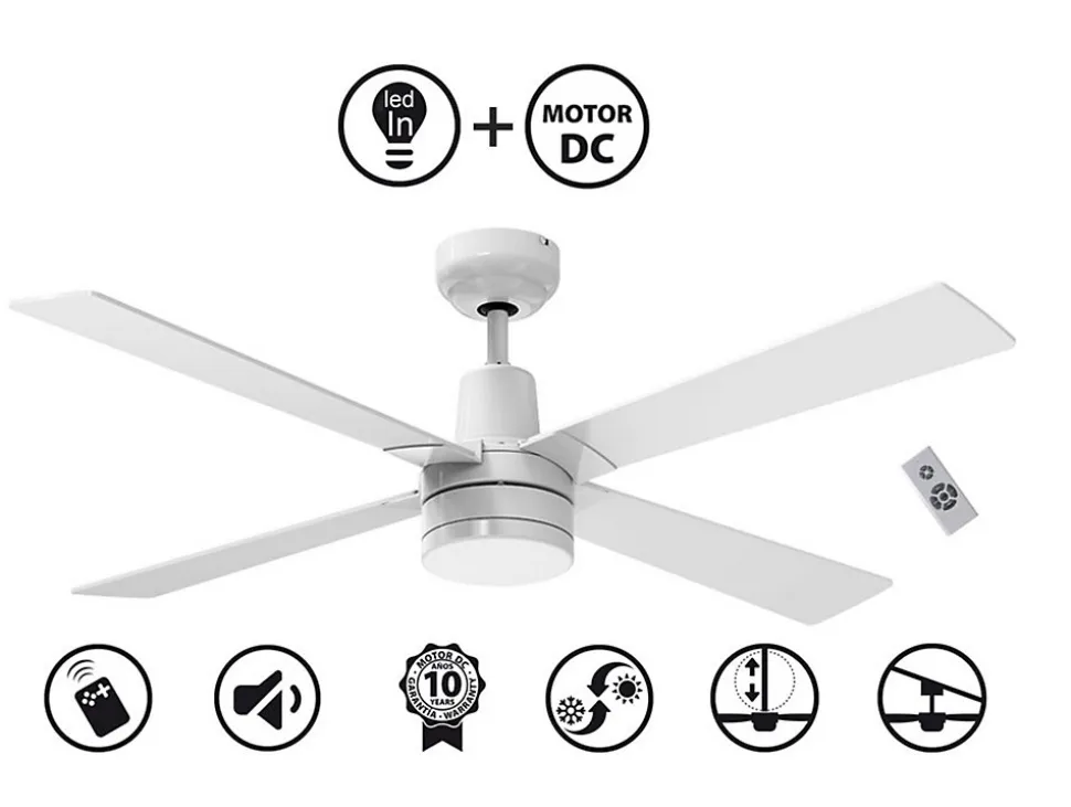 L’ELECTRA est un ventilateur de plafond à LED 12 W qui se distingue par sa multifonctionnalité. Il a un moteur en acier à courant continu de 22 W qui atteint une grande vitesse, en plus de ses 4 pales MDF et grand diamètre (122cm) le rendent idéal pour les surfaces jusqu’à 25m2. Ce modèle est réversible, désestratificateur d’air, de sorte qu’en hiver, vous pouvez inverser ses pales pour que son mouvement déplace l’air chaud vers le bas, agissant en complément de votre système de chauffage et favorisant une consommation optimisée. Il comprend un thermostat dans sa base de sorte que vous pouvez le programmer pour que le ventilateur fonctionne en fonction de la température ambiante. Il offre un système HYPERSILENCE, une technologie super silencieuse qui ne dépasse jamais 38dB à la vitesse 3 et qui permet d’utiliser le ventilateur la nuit ou pendant les pauses, offrant des performances très silencieuses. Il a également une fonction Mémoire qui permet d’enregistrer les paramètres utilisés, à la fois en vitesse et en lumière, de sorte que lorsque vous éteignez le ventilateur, il est enregistré et redémarré avec les mêmes paramètres. Parmi ses nombreux avantages, il y a la protection IP20 contre la poussière, 6 vitesses, télécommande et connexion Wi-Fi via l’application Tuya Smart, pour contrôler le ventilateur depuis n’importe quel appareil mobile. >Son design argenté est élégant et robuste, il a une hauteur de 28 cm et peut s’adapter aux plafonds jusqu’à 27º d’inclinaison.