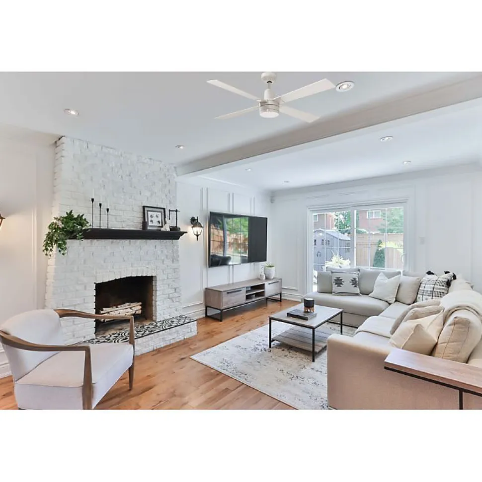 - Ventilateur de plafond connecté, usage via une application domotique possible (par exemple Tuya Smart), compatible iOS et Android