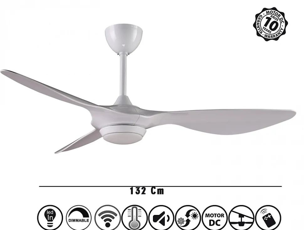 L’HELIX WHITE est un ventilateur de plafond à LED 12W qui se distingue par sa multifonctionnalité. Il a un moteur à courant continu de 35 W qui atteint jusqu’à 185 tours par minute. En outre, ses 3 pales ABS et grand diamètre (132cm) le rendent idéal pour les surfaces jusqu’à 55m2. Ce modèle est réversible, désestratificateur d’air, de sorte qu’en hiver, vous pouvez inverser ses pales pour que son mouvement déplace l’air chaud vers le bas, agissant en complément de votre système de chauffage et favorisant une consommation optimisée. Il comprend un thermostat dans sa base de sorte que vous pouvez le programmer pour que le ventilateur fonctionne en fonction de la température ambiante. Il offre un système HYPERSILENCE, une technologie super silencieuse qui ne dépasse jamais 38dB à la vitesse 3 et qui permet d’utiliser le ventilateur la nuit ou pendant les pauses, offrant des performances très silencieuses. Il a également une fonction Mémoire qui permet d’enregistrer les paramètres utilisés, à la fois en vitesse et en lumière, de sorte que lorsque vous éteignez le ventilateur, il est enregistré et redémarré avec les mêmes paramètres. Parmi ses nombreux avantages, il y a la protection IP20 contre la poussière, 6 vitesses, télécommande et connexion Wi-Fi via l’application Tuya Smart, pour contrôler le ventilateur depuis n’importe quel appareil mobile. Son design blanc est élégant et robuste. Il comprend deux tiges de 25cm et 12,5 et accepte les tiges de 60cm, ce qui le rend adapté à tous les types de plafonds.