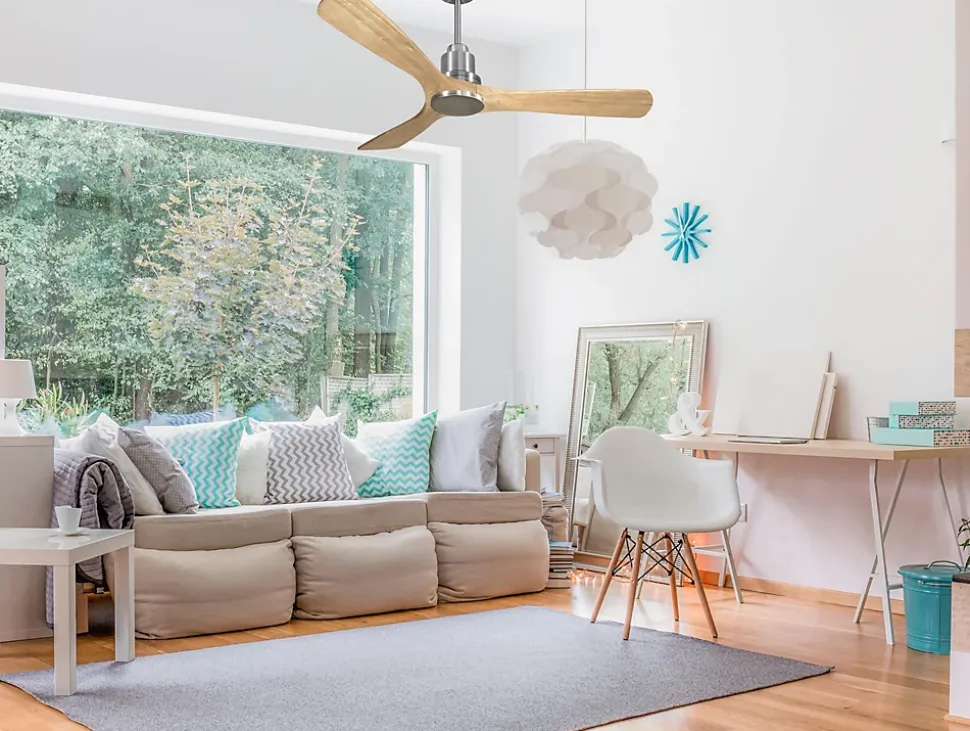 - Ventilateur de plafond connecté, usage via une application domotique possible (par exemple Tuya Smart), compatible iOS et Android