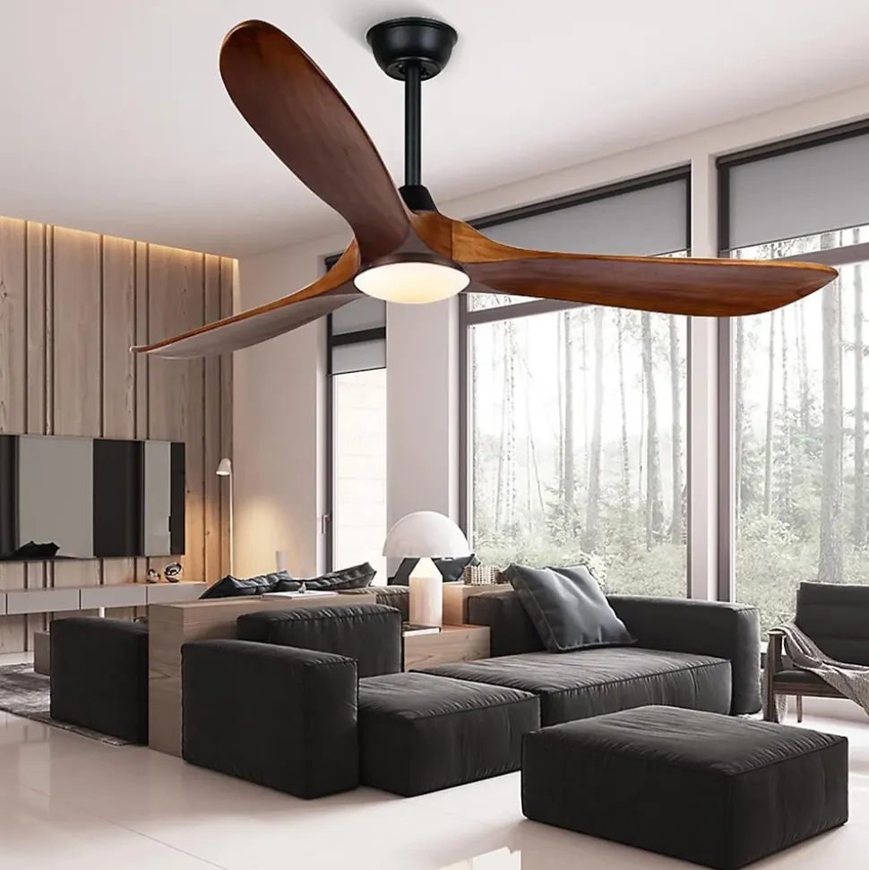 Ce ventilateur de plafond réversible et silencieux (nuisance sonore max à pleine vitesse : 25 db), disponible avec ou sans lumière et au design rétro, apportera une touche de charme rustique à n’importe quelle pièce de votre maison ou de votre entreprise. Il dispose de trois vitesses et peut-être utilisé comme destratificateur pour inverser l’air chaud ou froid, selon vos besoins.Disponible en bois, noir et avec lumière.Fabriqué en bois durable, il est facile à installer, entretenir et est parfait pour les espaces de petite ou grande taille. Grâce à sa télécommande pratique, vous pouvez facilement contrôler les réglages du ventilateur à distance, sans avoir à vous lever de votre siège. Produit disponible en Ø223 cm 2 barres d’extensions (1 de 10 cm et 1 de 20 cm) sont inclus. La hauteur totale est de 42 cm avec la barre de 10 cm et de 52 cm avec celle de 20 cm.Le ventilateur est prévu pour une installation sur un plafond en pente jusqu’à 30°. Autrement, il faudra nous contacter après commande pour obtenir la pièce nécessaire.Support plafond : Ø15 cm / Émission : <25 db / Certification : CEPuissances et vitesses maximales par dimensions :108 cm / 25w / 178 tr/min / 6.5 kgGarantie : 3 ans // Débit max. : 4100 m3/h // Type de commutateur : Télécommande avec réglage de la vitesse, du timer et fonction réversible, piles télécommande : AAA.Matériaux : Fer, bois (noyer) // Moteur : DC // Nombre de pales : 3Ampoule LED : 32W avec 3 modes de lumière : blanc chaud, blanc froid, mix blanc chaud et froid // Utilisation : Intérieur // Source de lumière : LED // Non dimmable