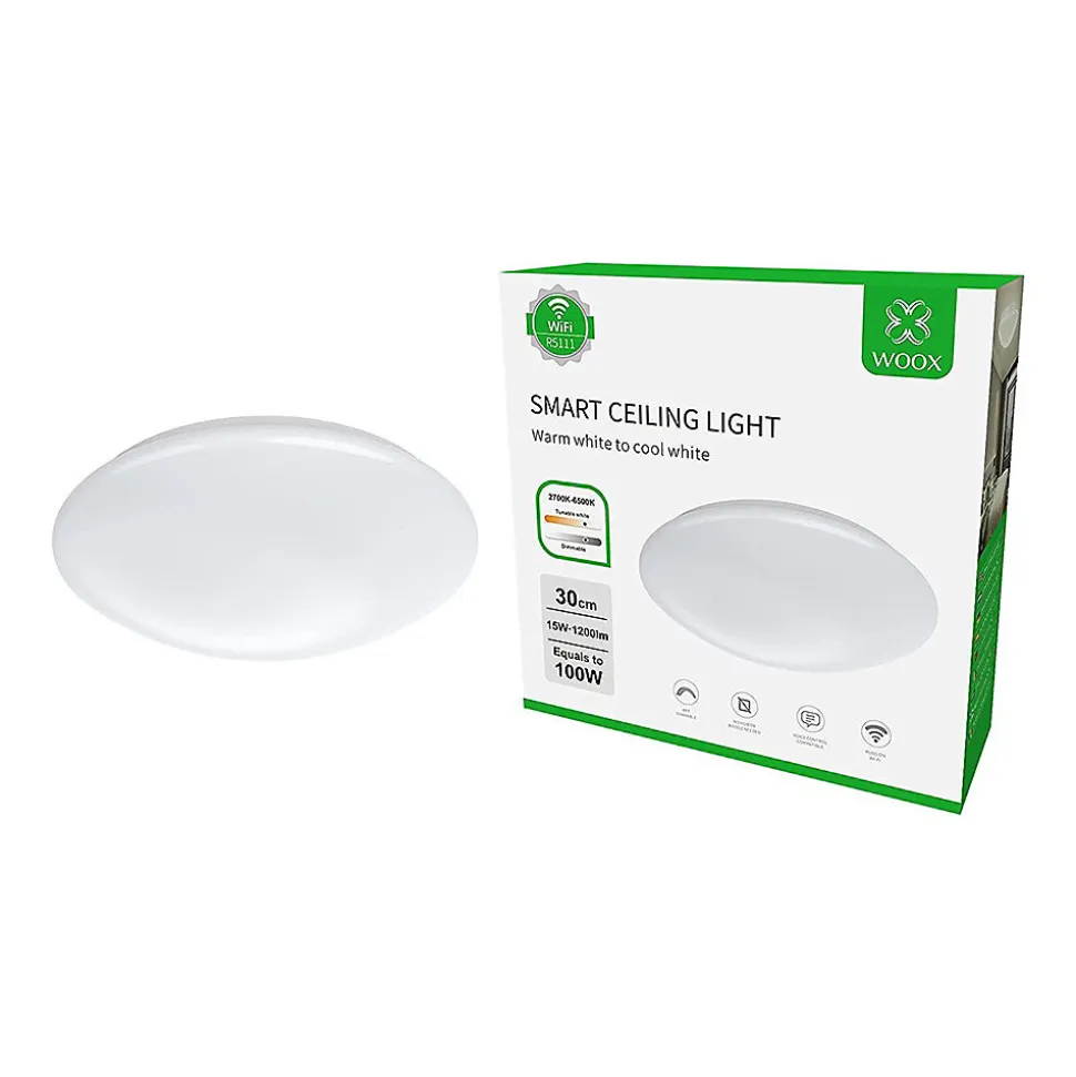 Plafonnier intelligent – R5111 – WOOKSi vous souhaitez transformer l’éclairage de votre maison connectée, le plafonnier Wifi intelligent conçu par la marque WOOX offre plusieurs options. Le modèle avec la référence R5111 est doté d’une technologie d’éclairage LED à spectre complet, offrant une plage de températures de couleur allant de 2700 à 6500K. Cette fonctionnalité permet de passer facilement du blanc chaud au blanc froid, selon vos besoins.Ce plafonnier intelligent de WOOX fonctionne sur Wi-Fi 2,4 GHz. Ainsi, vous pouvez le contrôler facilement depuis votre smartphone ou votre tablette, sans avoir besoin d’un hub ou d’un service d’abonnement payant. Par ailleurs, l’application WOOX Home installée sur votre téléphone vous permet de fixer des horaires pour allumer ou éteindre l’éclairage.Cet équipement R5111 prend en charge aussi une commande vocale. Il est compatible avec Amazon Alexa et Google Assistant. Grâce à cette option, vous pouvez utiliser votre voix pour commander votre plafonnier ou ajuster la couleur et l’intensité de l’éclairage. Le plafonnier Wifi intelligent- R5111 de la marque WOOX peut être aisément installé avec ses dimensions 300 x 300 x 95mm, son poids de 445 grammes ainsi que sa configuration simple. En optant pour ce modèle, vous ne risquez pas de tomber sur une mauvaise surprise sur votre facture d’électricité, il consomme moins d’énergie que les luminaires traditionnels.Caractéristiques principales :Poids net du produit : 445 grammesTaille du produit : 300x300x95mmProtocole sans fil : WiFi IEEE 802.11 b/g/n 2,4 GHzPuissance de transmission maximale : 16,24 dBmTension nominale : 230 V ~ 50 HzMatériau de la couverture : PCProtection contre les intrusions (IP) : IP20Type de LED : SMD2835 18V/60mA 6 pièces, 9V/100mA 18 piècesTempérature de couleur corrélée : WW2700K-CW6500KDurée de vie : 25 000 h