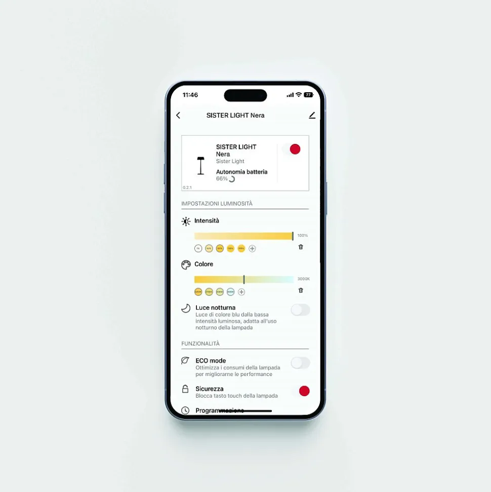 DONNÉES TECHNIQUESGRADATEUR TACTILE LED2200-2700-3000-4000K | IRC > 90250-275-296-338 ml | 3,2W | IP655 Vcc maximum 2ACorps en aluminium anodisé brossé ou peint et diffuseur prismatique en polycarbonate. Convient pour un usage externe (lampe IP65) et interne (lampe sur socle de chargement IP20).Résistance aux chocs (IK07) et au brouillard salin (1500h). Durée 8 – 58 h, en fonction du réglage du flux lumineux et des paramètres Wi-Fi. Temps de charge à 2A : 5 hBatterie au lithium rechargeable et remplaçable AVERTISSEMENTS Pour fonctionner, la lampe doit être connectée à un réseau Wi-Fi 2,4 GHz. Le micrologiciel de l’appareil peut être mis à jour à distance.Sister Light Wi-fi est une lampe design idéale pour une utilisation dans les espaces extérieurs, les tonnelles, les bars, les restaurants et les espaces de détente, elle est également largement utilisée dans les chambres, les salons et les bureaux professionnels. Lampe de table LED design également adaptée à une utilisation en extérieurDimension : Ø11xH17cm, socle 10cmx10cm