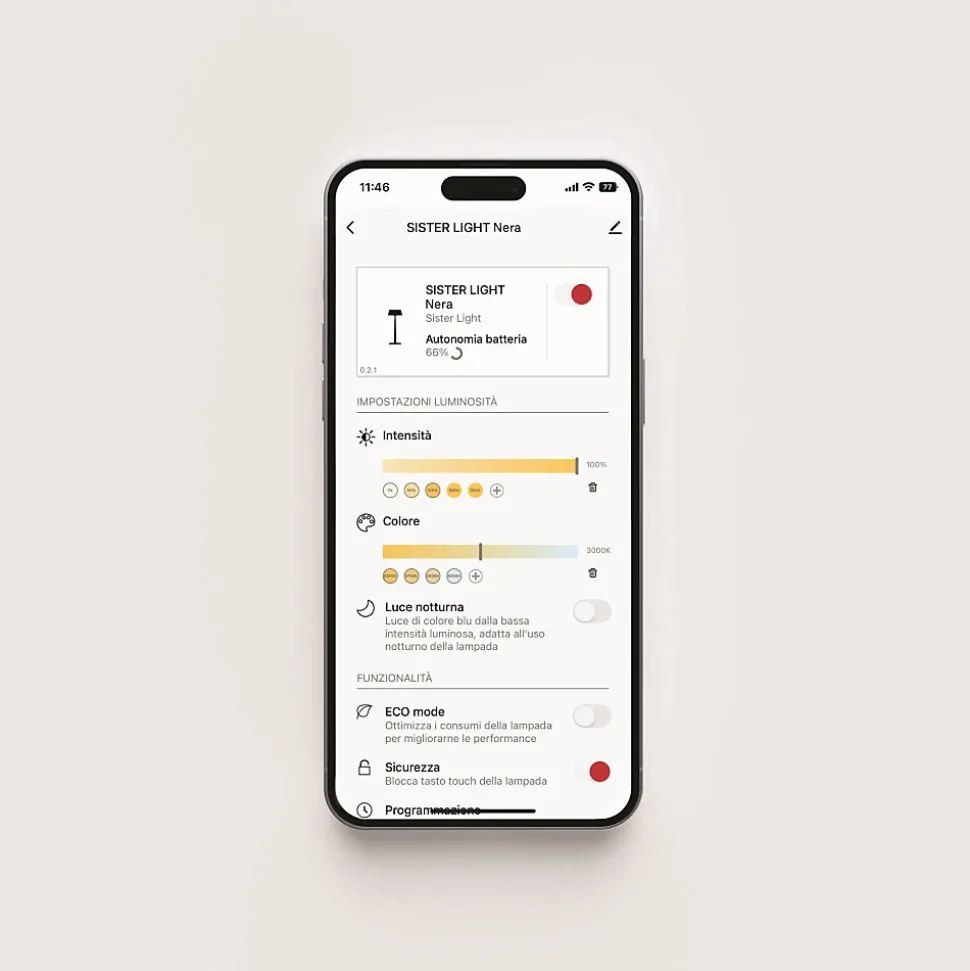 DONNÉES TECHNIQUESGRADATEUR TACTILE LED2200-2700-3000-4000K | IRC > 90250-275-296-338 ml | 3,2W | IP655 Vcc maximum 2ACorps en aluminium anodisé brossé ou peint et diffuseur prismatique en polycarbonate. Convient pour un usage externe (lampe IP65) et interne (lampe sur socle de chargement IP20).Résistance aux chocs (IK07) et au brouillard salin (1500h). Durée 8 – 58 h, en fonction du réglage du flux lumineux et des paramètres Wi-Fi. Temps de charge à 2A : 5 hBatterie au lithium rechargeable et remplaçable AVERTISSEMENTS Pour fonctionner, la lampe doit être connectée à un réseau Wi-Fi 2,4 GHz. Le micrologiciel de l’appareil peut être mis à jour à distance.Dans le colis vous trouverez : le piquet Wi-fi SISTER LIGHT, la base de chargement par contact et 2 tiges pour allonger le corps de votre lampe.Sister Light Wi-fi est une lampe design idéale pour une utilisation dans les espaces extérieurs, les tonnelles, les bars, les restaurants et les espaces de détente, elle est également largement utilisée dans les chambres, les salons et les bureaux professionnels. Lampe de table LED design également adaptée à une utilisation en extérieurDimension : Ø13,2xH17cm, socle 10cmx10cm