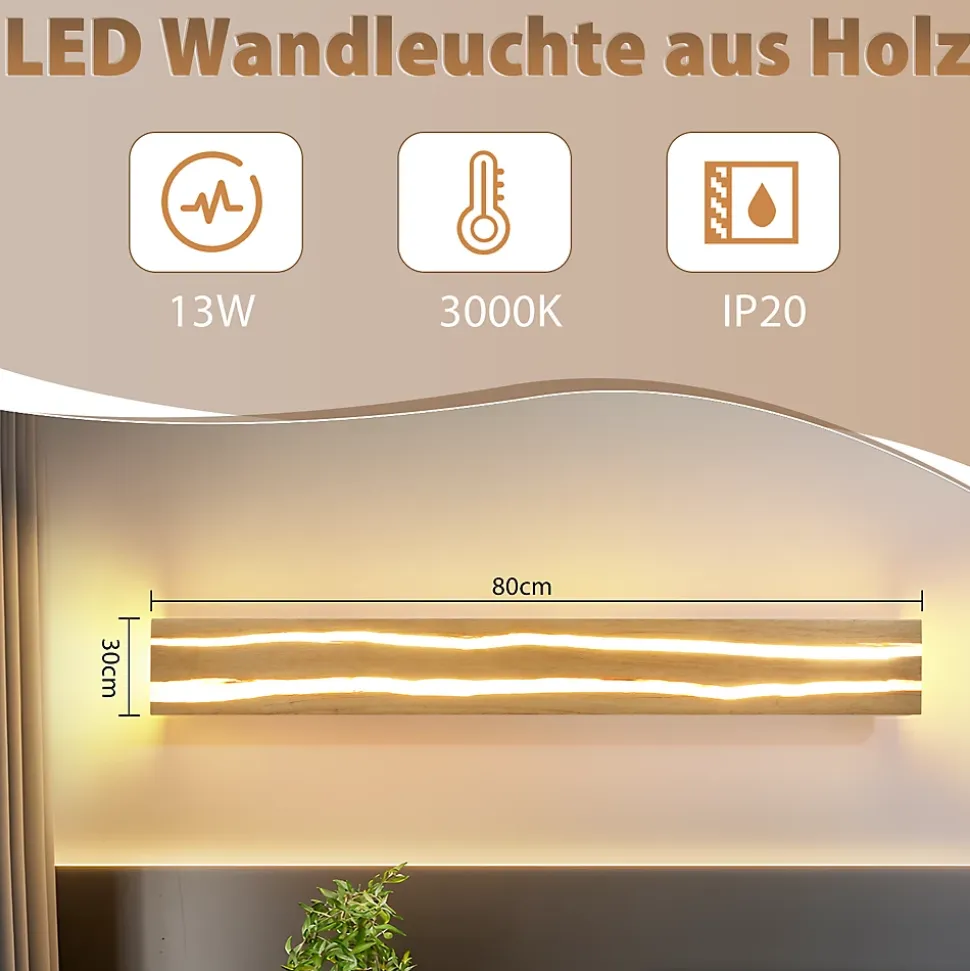 Applique murale LED en bois : Le bois est un matériau renouvelable, et sa production et sa transformation ont un impact environnemental moindre que celles d’autres matériaux non renouvelables (comme le plastique, le métal, etc.). Choisir une applique murale LED en bois contribue à réduire l’impact environnemental. L’alliance du bois et d’éléments naturels confère à l’intérieur une ambiance originale et authentique, rendant la pièce plus chaleureuse et intime.Unicité et savoir-faire : Les appliques murales en bois craquelé présentent des textures et des formes uniques. Chaque craquelure est une œuvre d’art à part entière, ajoutant des effets visuels uniques et une atmosphère artistique à la pièce. En tant que luminaire décoratif, elles remplissent également leur fonction d’éclairage classique, fournissant une lumière adaptée et créant de magnifiques jeux d’ombre et de lumière grâce au filtre des craquelures.Caractéristiques techniques : Matériaux : Bois et métal ; Longueur : 80 cm ; Largeur : 30 cm ; Tension : 230 V ; Consommation : 13 W ; Température de couleur : Blanc chaud 3000 K. Indice de protection : IP20Décoration lumineuse : Cette applique murale en bois est idéale pour éclairer salons, couloirs, chambres, salles à manger, etc. Le veinage du bois lui confère un style unique ; son design original la distingue du mur et en fait un bel élément décoratif.Installation facile : Nos appliques murales LED sont fournies avec des instructions détaillées qui vous guident à chaque étape de l’installation, pour une mise en place rapide et facile. Cette applique est également un cadeau idéal, parfait pour offrir à la famille, aux amis ou aux collègues à l’occasion d’une pendaison de crémaillère, d’un mariage, de Noël ou de toute autre fête.