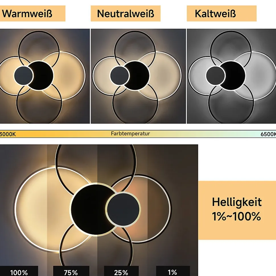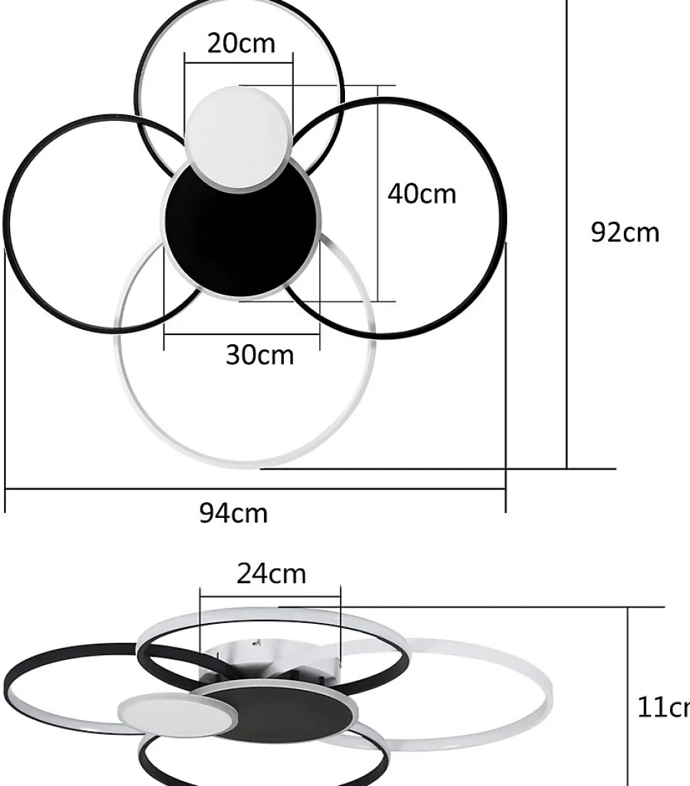 Matériel : plafonnier led moderne à anneau qui peut être installé directement sous le plafond. Il est fabriqué en métal de haute qualité et en acrylique. La qualité du plafonnier est testée et il n’est pas facile de causer des rayures qui affectent l’apparence de la lumière.Éclairage réduit : le plafonnier est livré avec une télécommande qui vous permet de modifier en continu la luminosité et la température de couleur (blanc chaud/blanc froid/neutre). La luminosité et l’ambiance de l’éclairage intérieur peuvent être réglées pour répondre aux besoins de scènes ininterrompues.Dimensions : 94 x 92 x 11 cm, tension : 230 v, puissance : 72 w, 5 760 lumens. Ampoule led à montage permanent (non remplaçable) d’une durée de vie de 30 000 heures.Adapté à : le plafonnier noir est parfait pour les espaces modernes tels que les restaurants, les cuisines, les bureaux, les salons, les chambres à coucher, les bureaux, les salles à manger, les hôtels, les restaurants et bien plus encore.