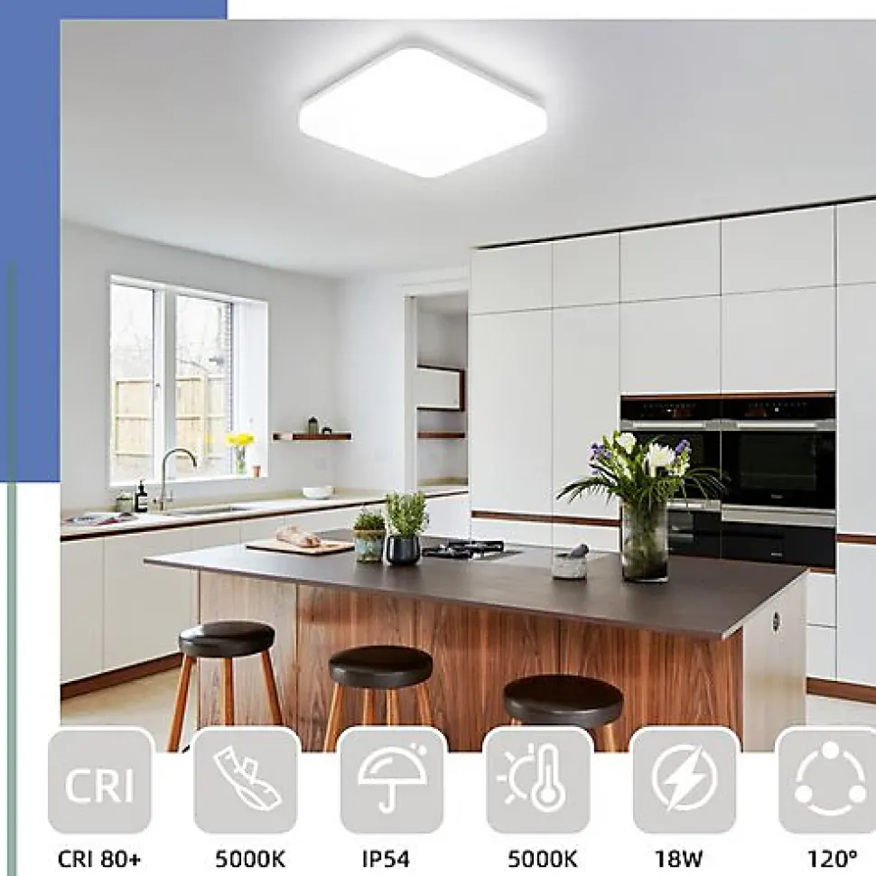 [design épuré] avec ses 22 cm de côté, ce plafonnier à led présente des lignes minimalistes. Son apparence élégante s’adapte parfaitement à tout type de décoration intérieure. L’éclairage blanc froid crée une atmosphère chaleureuse et confortable. [détails techniques] ce luminaire de salle de bain 18w de haute qualité peut remplacer directement une ampoule de 180w et est encore plus économe en énergie. Elle a une durée de vie allant jusqu’à 25 000 heures. Type de lampe : led ; puissance : 18w ; température de couleur : 5000k ; dimensions : 22*22*4.8cm ; matériau : plastique ; tension : 230v. [protection des yeux] le plafonnier de la lampe de chambre à coucher fournit une lumière vive et naturelle qui nous permet de percevoir avec précision les couleurs originales des objets. L’abat-jour est semi-transparent, ce qui permet un éclairage uniforme et doux sans éblouissement ni scintillement. Cela permet de réduire et de protéger efficacement la fatigue oculaire. [polyvalence] le plafonnier led ip54 peut facilement être utilisé dans la salle de bain, sur le balcon et dans la cave à vin, et empêche la poussière et les insectes de pénétrer à l’intérieur de la lampe. Son matériau de gaine de protection efficace convient pour la salle de bain, la chambre à coucher, le couloir, la cuisine, la cave, le bureau, la chambre d’enfant ou le salon. [service après-vente] nous offrons une garantie de 2 ans sur notre éclairage et notre service clientèle est aussi unique que notre design de lampe moderne, la qualité est impressionnante. Si vous avez des questions, n’hésitez pas à nous contacter.: