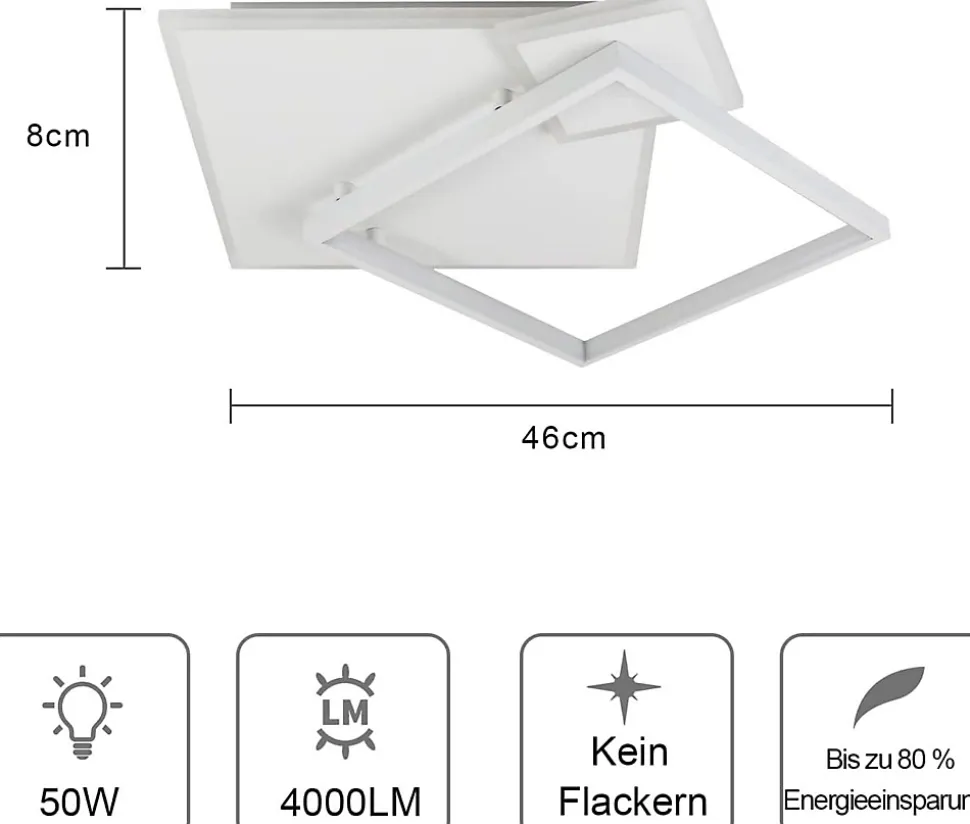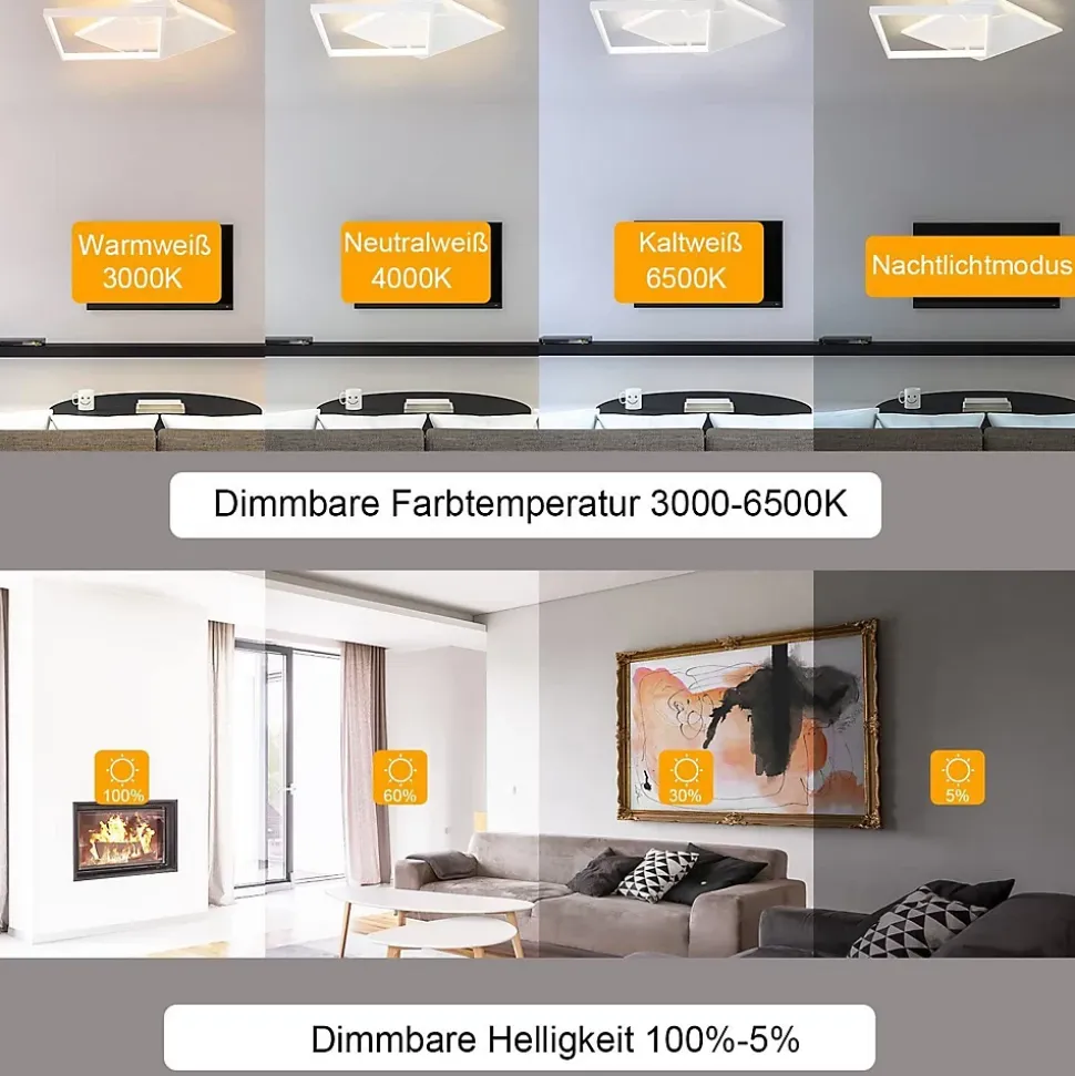 Produit : le plafonnier led dimmable zmh square aluminium est un outil d’éclairage pur, parfait pour une utilisation dans les espaces de vie modernes. Les trois cubes en aluminium sont équipés de bandes led à l’intérieur, et la lumière qui passe à travers l’acrylique produit un haut niveau de luminosité, ce qui leur permet d’éclairer correctement les grandes pièces.Variable : la couleur de la lumière peut être réglée sur trois niveaux à l’aide d’un interrupteur mural standard. La télécommande permet de régler en continu la luminosité (10 %-100 %) et la température de couleur (3 000-6 500 k) du plafonnier. La lumière de 4 000 lm permet d’éclairer des pièces telles que le salon ou la chambre à coucher.Détails : taille de la lampe : 45*46*8 cm;puissance : 50 w;lumen : 4000 lm;tension : 230 v;matériau : aluminium+métal+acrylique;couleur : blanc;température de couleur : 3000k-6500k;gradation : oui;avec télécommande : oui.Retard d’arrêt + mode protection des yeux : ce plafonnier de zmh peut être retardé à l’aide d’une télécommande. Il suffit d’appuyer sur le bouton de retardement de l’extinction de la télécommande pour que le plafonnier s’éteigne au bout de 60 secondes. appuyez sur le bouton pour le mode veilleuse et le plafonnier fonctionnera à faible puissance, parfait pour ceux qui aiment dormir avec les lumières allumées ou se réveiller la nuit.Application : ces plafonniers sont parfaits pour éclairer les salons et les chambres à coucher. Ils sont également parfaits pour éclairer les couloirs, les cuisines, les cages d’escalier, les bureaux, les hôtels et les restaurants.