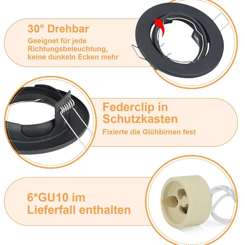 [spécification] vous recevrez 6 cadres de montage blancs avec 6 roulements gu10 en céramique et des ressorts de retenue. (ces spots encastrés sont compatibles avec n’importe quelle lampe de 50 mm de diamètre, qu’il s’agisse d’une led ou d’une lampe halogène ![avec ce spot encastré, vous n’avez pas besoin d’utiliser l’ensemble du spot. Cette lampe gu10 peut être facilement remplacée, ce qui permet d’économiser du temps et de l’argent. Le cadre protège la lampe de la poussière, de l’humidité et d’autres contaminants, ce qui prolonge la durée de vie de la lampe et contribue ainsi à la protection de l’environnement ![faisceau réglable] ces spots encastrés peuvent être orientés à 30° pour ajuster l’angle d’éclairage à vos besoins. Cela permet d’ajuster l’éclairage individuellement et de créer une atmosphère lumineuse et accueillante dans la pièce. Le design épuré et minimaliste des spots suspendus complète le style de l’intérieur et rend la pièce plus belle et plus spacieusesûr et fiablenos cadres d’éclairage encastré sont fabriqués en métal épais et traités avec de l’antirouille. Le cadre est résistant à la corrosion, stable et robuste. Le spot encastré protège la lumière de tout contact et évite les chocs électriques. l’utilisation du cadre de montage améliore également la dissipation de la chaleur et prolonge la durée de vie de l’éclairage. Nos cadres de montage sont donc un choix sûr et fiable !: