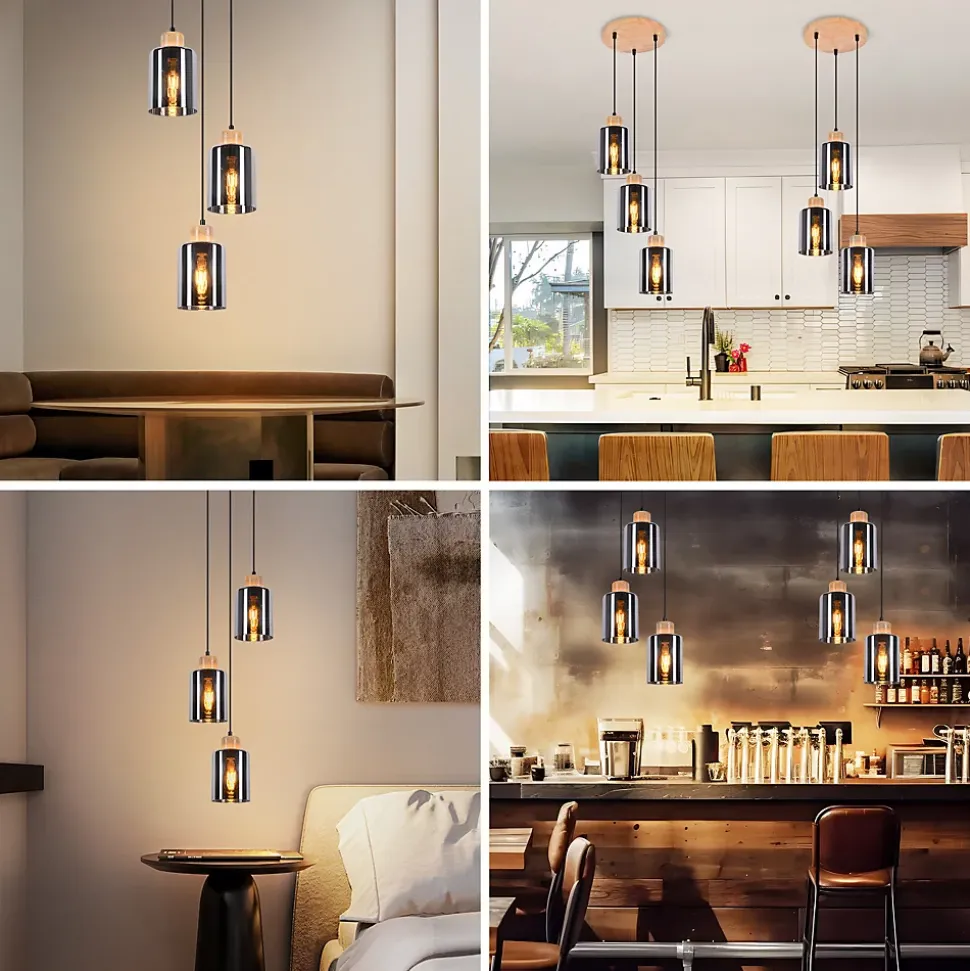 Éléments en verre et en bois pour un look de haute qualité : la suspension est en bois et en verre et possède un abat-jour gris fumé simple. La combinaison du verre et du bois confère à la lampe une élégance naturelle. Grâce aux matériaux robustes et à la fabrication de haute qualité, la lampe est durable et constitue donc l’investissement parfait pour votre maison. Flexibilité et adaptabilité : une particularité de cette lampe de salle à manger est sa conception réglable en hauteur. Cela signifie que vous pouvez régler la hauteur du lustre jusqu’à 120 cm selon vos besoins. Taille du plateau de couverture : 22*2,5 cm ; taille de l’abat-jour : 12*15 cm ; cela signifie que vous pouvez contrôler comment et où l’abat-jour est suspendu, quelle que soit la taille ou la disposition de la pièce. Lampe de table à manger décorative : cette lampe de table à manger a une tension de connexion de 230 volts et vous offre quatre ampoules d’une puissance maximale de 4 x 25 watts. La base des ampoules est e27, une lampe courante et facile à trouver. Attention : l’ampoule n’est pas incluse dans la livraison. Design vintage pour la salle à manger : la lampe suspendue est conçue dans un style rétro et industriel et deviendra un nouvel accroche-regard dans votre maison grâce à la combinaison de matériaux. Donnez à votre salle à manger une touche industrielle décorative avec la suspension de la série. Application : grâce à son look industriel, la suspension est non seulement superbe dans votre propre maison, mais s’intègre également tout aussi bien dans un café, un bar ou un restaurant, créant ainsi une atmosphère particulière. Que ce soit dans le salon, la salle à manger, la cuisine ou le couloir, cette suspension s’intègre partout. Il est particulièrement beau sur une table.